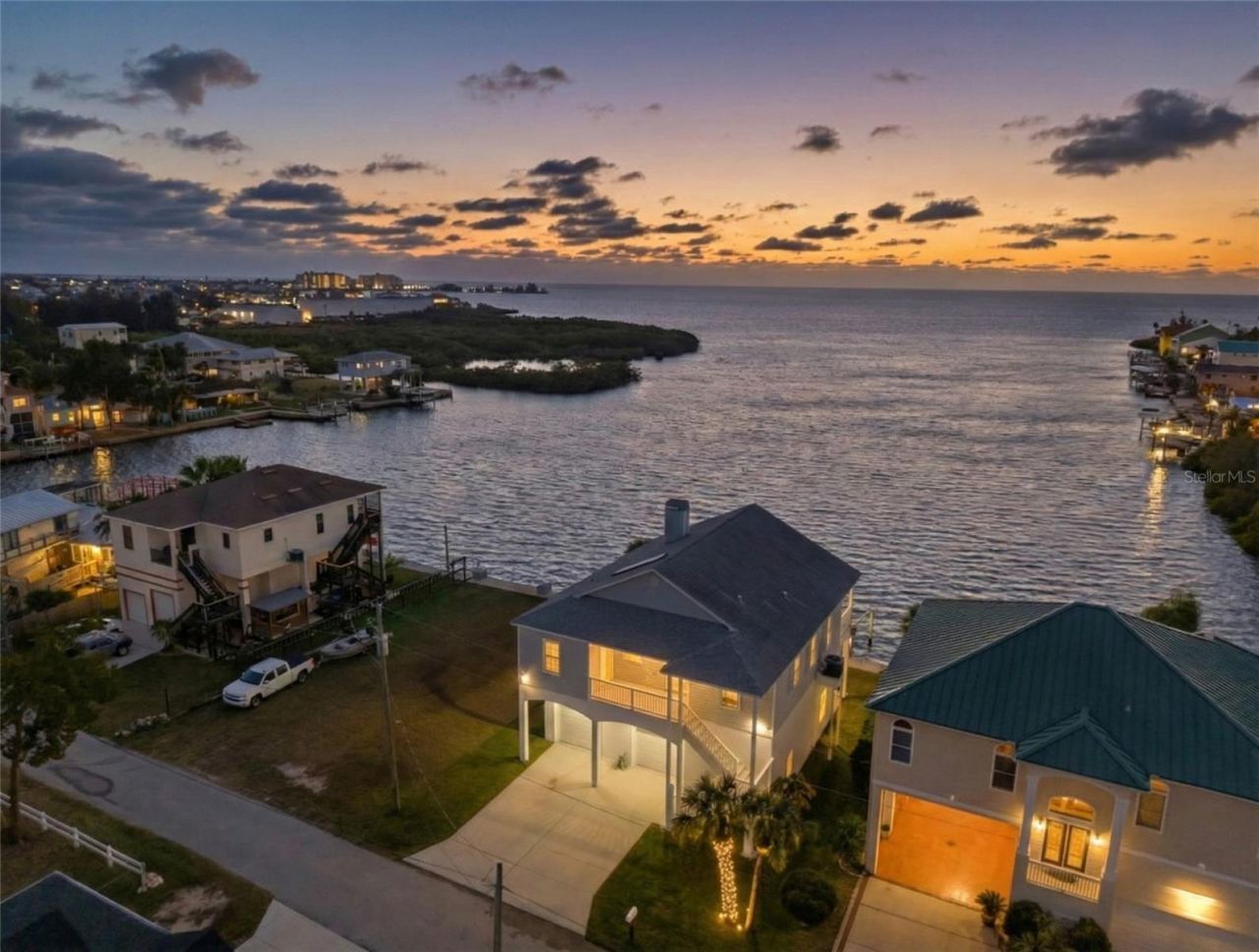 POETIC & PEACEFUL. Ideally positioned on a wide water basin with natural buffering and direct, unobstructed access to the Gulf of Mexico. This elevated waterfront home offers breathtaking sunset views and water visibility from all living areas. Custom built by the current owner, this home has been meticulously cared for and proudly maintained by its original owner since construction. The main living area features soaring vaulted ceilings ranging from approximately 10 to 16 feet, expansive windows at every angle, with a double sided wood burning fireplace connecting both the great room and the primary bedroom. The home offers 3-bedrooms and 2-bathrooms with approximately 1,800 square feet of heated living space. A private elevator services the home. A spiral staircase provides additional access from the garage to the main living area. Below the home is approximately 1,640 square feet of garage space, offering extensive storage and flexibility. Covered outdoor living areas include approximately 1,200 square feet of open porches, creating multiple spaces to enjoy coastal breezes and sunsets. Items worthy of mention; Full HVAC system replacement in 2024 with a hypoallergenic filtration system added, complete new roof installed in 2019, (4) garage doors replaced in 2024, 80-gallon solar water heater (2018), whole house fan system, hurricane shutters and panels throughout, The home is equipped with (2) whole home electrical shutoffs, main electrical panel and subpanel, and a Goldline whole home electrical surge protection system installed at the main panel. Stand up attic space with pull down ladder access, offering convenient storage and accessibility. The interior was fully painted in 2017 and the exterior was pressure washed in January 2026. Custom wood flooring selected by the owners, crafted from a blend of red and white oak harvested from an 80-acre wood lot in Michigan. Please note the four-car garage features approximately 20-foot ceiling height, and about 15-feet of clearance to the bottom of the rafters. Three garage doors are standard height at approximately 7 feet, with one oversized garage door measuring approximately 11 feet, ideal for larger vehicles or specialty storage. A well-maintained seawall with substantial concrete capping enhances the waterfront setting. Boat lift present and not currently operational. Charming waterfront cutout along the concrete seawall creates an intimate spot for launching kayaks, quiet fishing, or enjoying peaceful water view. Surrounded by mature trees and coastal habitat, the property regularly attracts dolphins and manatees and there is abundant birdlife including pelicans, herons, egrets, cormorants, loons, pileated rose beaks and other native species. Come own your Elevated Coastal Serenity today. Professional Video & Floorplan available upon request. Every day, your view unfolds like a living masterpiece, changing moment by moment.