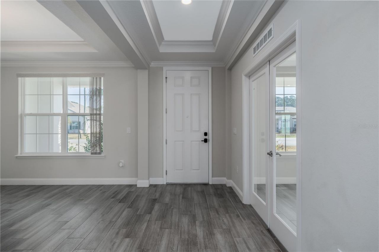 Impressive and beautifully upgraded home offering 3,024 square feet of living space, designed for space, comfort, and everyday luxury. This expansive residence features 4 bedrooms plus a large separate office/flex room with elegant French doors, providing exceptional versatility for work, study, or additional living space. The open-concept layout showcases high ceilings, crown molding, recessed lighting, and generously sized living areas filled with natural light. The kitchen is a true centerpiece, featuring granite countertops, a massive island with seating, stainless steel appliances, and abundant cabinetry-ideal for both entertaining and daily living. The primary suite is a standout, offering tray ceiling details and a spa-style bathroom with a large garden tub, dual granite vanities, and a glass-enclosed walk-in shower-creating a private, relaxing retreat. A rare and highly desirable feature is the dedicated laundry/utility room, designed as a true room rather than a closet, complete with a utility sink, built-in cabinetry for organized storage, and washer and dryer already included. Ceramic tile flooring flows throughout the main living areas, while durable vinyl plank flooring adds warmth and comfort in the bedrooms. Step outside to a covered and screened lanai overlooking a fully fenced backyard, offering privacy and space for outdoor living and entertaining. Additional features include full soffit exterior lighting and additional blown fiberglass insulation for improved energy efficiency. Located in a well-established neighborhood with NO HOA, this home offers both freedom and convenience with easy access to town center, shopping, restaurants, medical facilities, and major roadways. Finished with quality details throughout and featuring a 3-car garage and wide driveway, this home delivers space, upgrades, location, and flexibility-without HOA restrictions.